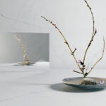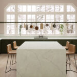 A pearl-white backdrop crisscrossed with crackling dark grey veins that rush over the illuminated shelllike surface with its blushed undertones, imprinting a dynamic dimension heightened by the Honed finish in a unique design that is truly innovative.