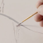 A crisp white base interlaced with thin linear sweeps of bronze and copper impressed on the cloudy surface in various intensities, like ancient pathways viewed from afar, creating a calm topography, soothing, and filled with light.
